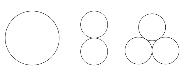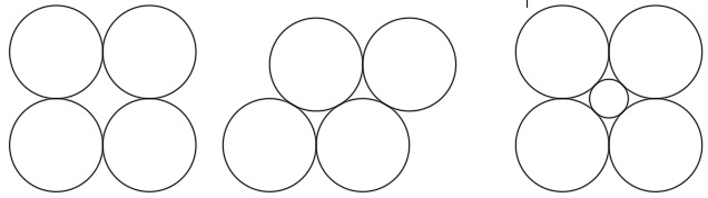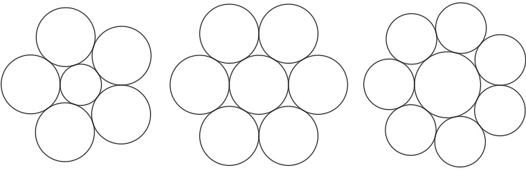 Four wires is unstable. Although each wire has two points of contact the points of contact can move and is shown in the following sketches. For a “four” wire strand to be stable a small fifth wire needs to be added as a core to provide support for the wires and prevent the construction from collapsing. Thus a four wire strand will become a five wire strand. From this point, strand shape is dictated by the geometry of round wires, and as larger more flexible strands are required more wires are added.
